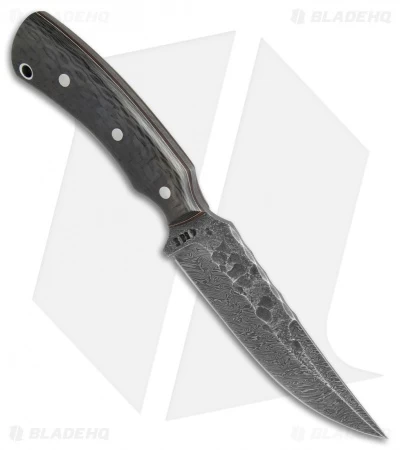The Kovda is a fine handcrafted fixed blade from Olamic Cutlery. Its full-tang high carbon vanadium Damascus trailing point blade has an upswept tip and swedge. The handle is fitted with rounded carbon fiber scales, offering a sleek aesthetic and a comfortable grip. Includes a leather sheath with belt loop and dangler attachment.