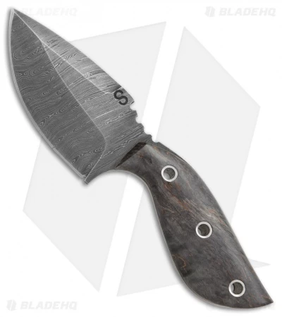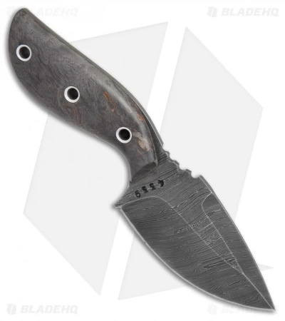 The Listok Skinner is a stout knife with a full-tang, wide-bellied blade and an ergonomic handle design. This model features Gray Karelian Birch Burl scales and a Damascus blade with ample jimping on the thumb ramp. It includes a dark leather sheath with a dangler attachment for comfortable belt carry.