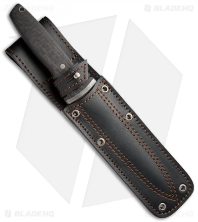 This piece features a high carbon vanadium Damascus steel spear point blade and bolster. The handle is carbon fiber with rounded edges and lightly textured faces. The Terzuola fixed blade comes with a premium leather sheath.