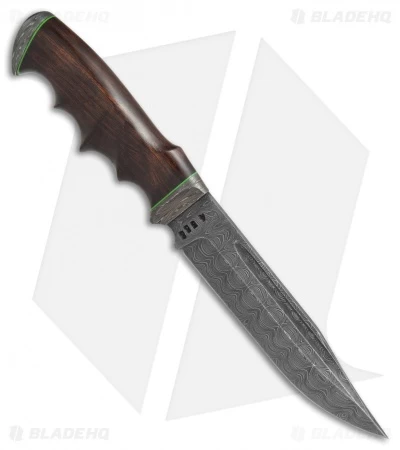 This Voykar HT fixed blade knife features a hand carved Ironwood handle with fluted finger grooves and green spacers. Its clip point blade is made from “Saturn’s Rings” pattern Damascus steel to match the bolster and pommel. The knife includes a premium leather sheath with a dangler attachment.