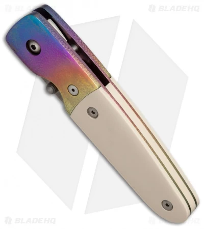 The Benchmade 850 Mel Pardue folder is an impressive gentleman’s knife. It features an ivory Micarta handle with spectrum anodized liners and bolsters. The spear point style blade is satin finished with a plain edge. The 850 comes with a leather pouch for pocket carry.